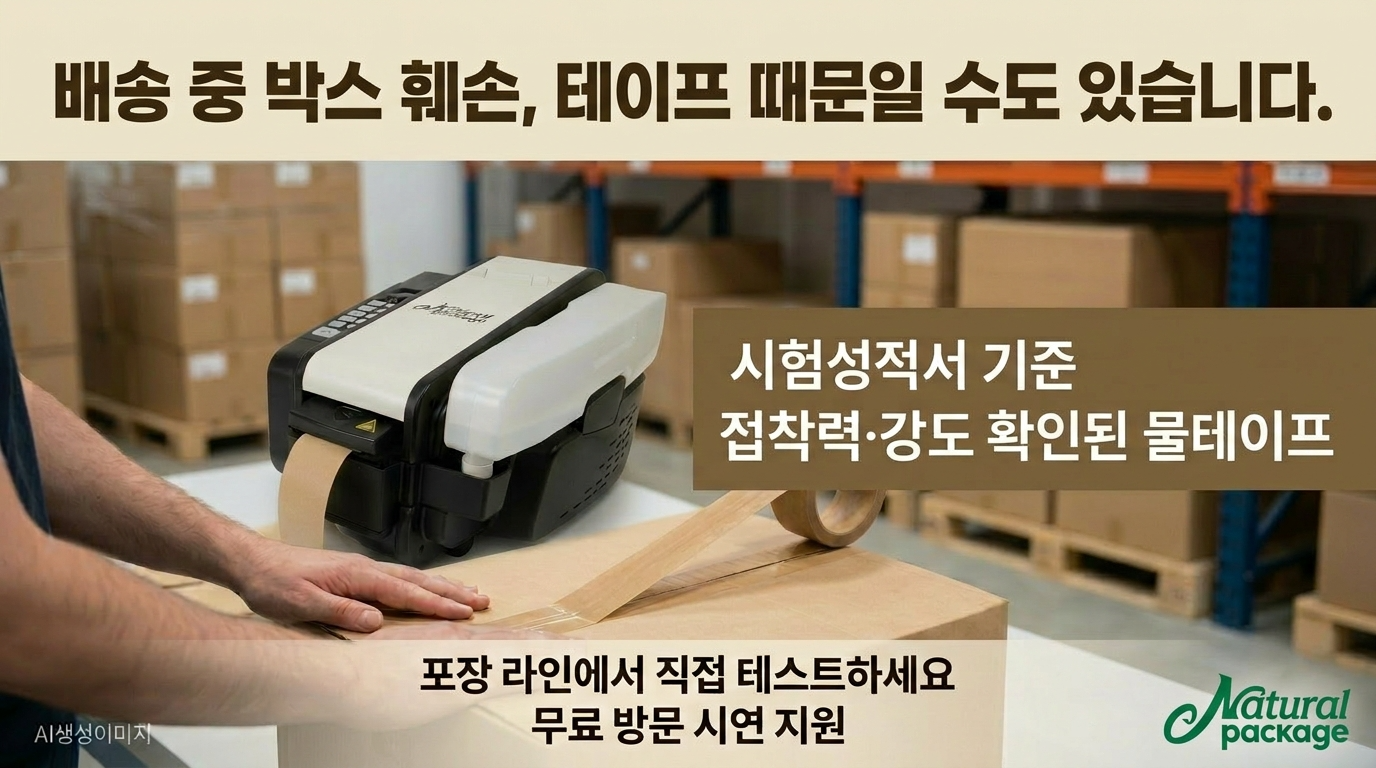 박스 두께를 늘리는 대신, 박스와 하나가 되어 완벽한 밀봉을 제공하는 물테이프를 고려해 보세요. 내츄럴패키지의 무료 방문 시연 서비스를 통해 부담 없이 그 강력한 성능을 직접 경험해 보시길 바랍니다. 테이프 하나를 바꾸는 작은 변화가 귀사의 물류 시스템을 한 단계 도약시키는 계기가 될 것입니다.