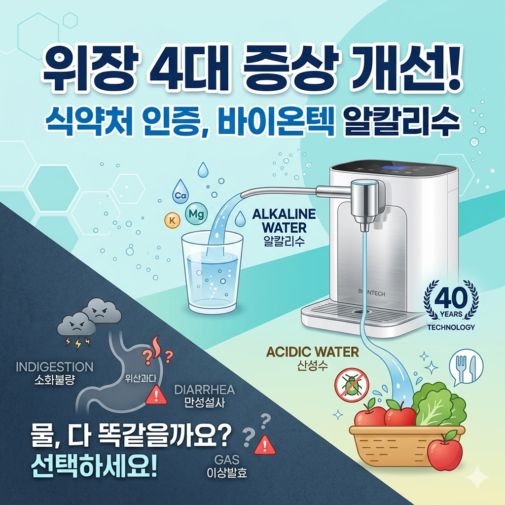 이번 포스팅에서는 단순한 정수기를 넘어 식약처로부터 4대 위장 증상 개선 효과를 인증받은 ‘알칼리 이온수’에 대해 심층적으로 다뤄보겠습니다. 40년 전통의 기술력이 집약된 바이온텍 알칼리수가 왜 ‘이유 있는 소비자들의 선택’을 받는지, 그 전문적인 이유를 정리해 드립니다.