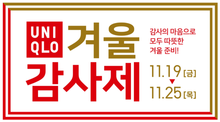 유니클로 겨울감사제 기간은 11월 19일부터 25일까지 7일간인데 금요일부터 다음주 목요일까지니까 유니클로 매장을 방문한다면 주말이 좋겠네요. 유니클로 온라인스토어에서는 겨울감사제기간에는 항상 구입할 수 있으니까 편한 시간에 앱을 접속해서 유니클로 할인품목 줍줍하면 될 거 같아요.