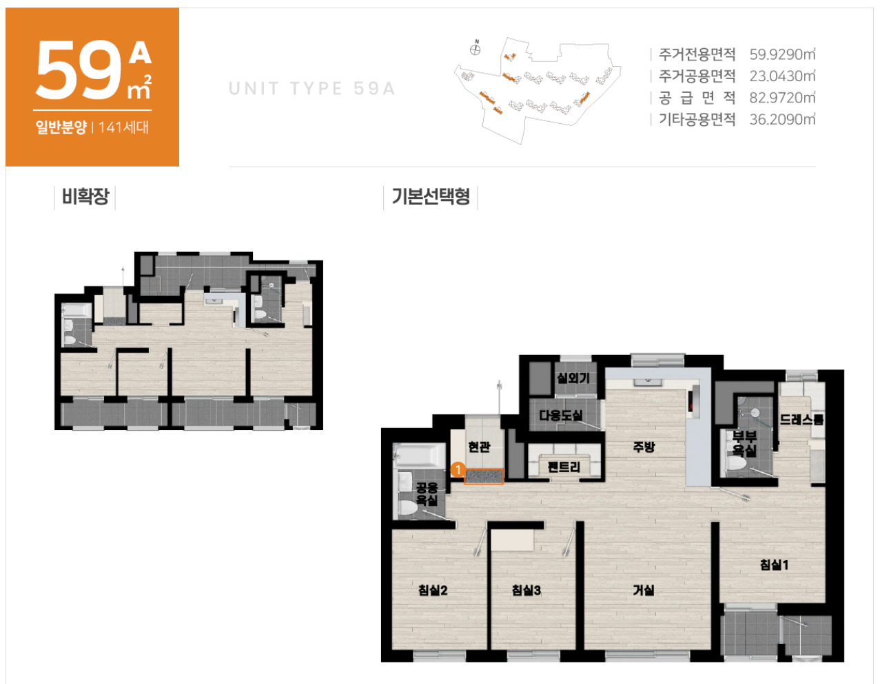 각 평형에서 가장 많은 세대수를 분양하는 평면으로 59A 141세대를 분양합니다.