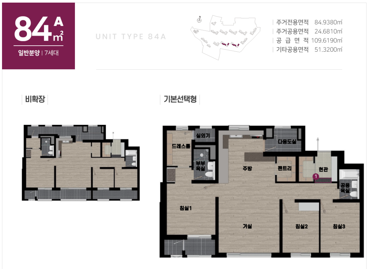 3가지 평형인 59㎥, 72㎥, 84㎥ 으로 구성되어 있으며 각 평형마다 3가지 타입으로 구분되었습니다.