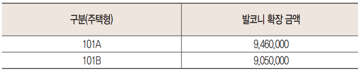 101A 평형 123세대는 5.13억 ~ 5.64억원으로 발코니확장비용 946만원