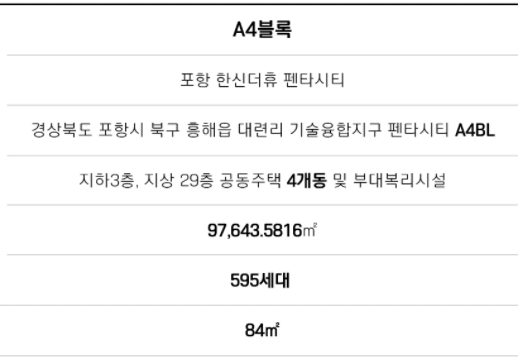 아파트 위치는 경상북도 포항시 북구 흥해읍 대련리로 한신더휴 펜타시티는 A2블록과 A4블록을 각각 인허가를 득한 개별사업장으로 청약 계약 시 분양평수와 세대수, 분양가가 다르기 때문에 분양내용을 참고하시기 바랍니다.