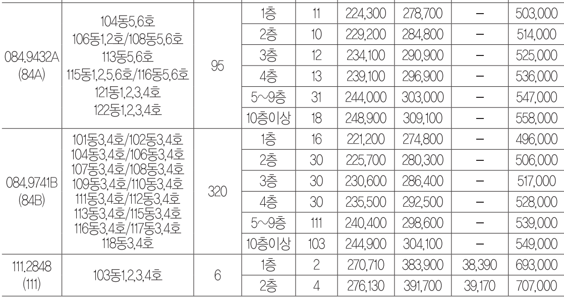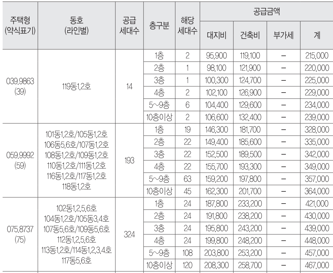 상기 공급금액은 분양가 상한제 미적용 주택으로 공급총액 범위 내에서 주탱형별, 층별 등으로 조정하여 책정한 금액입니다. 전용면적 85㎡ 이하 주택은 부가가치세 적용대상은 아니며, 전묭면적 85㎡ 초과 주택은 부가가치세가 포함된 금액입니다.