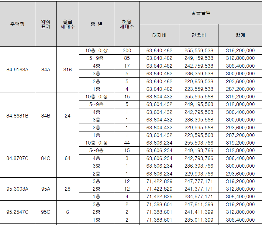 95 A타입, C타입 1층 306,400,000원 부터 10층 이상 319,200,000원으로 동일하며