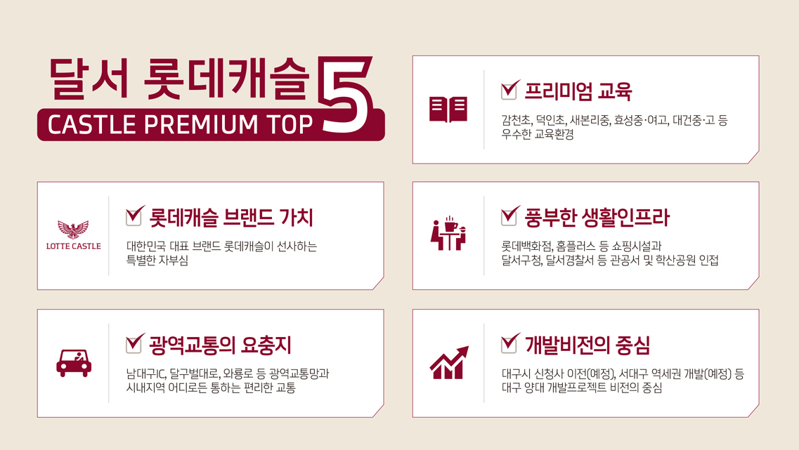 아파트가 들어서는 대구 달서구는 광역교통의 요충지로 남대구IC, 달구벌대로, 와룡로 등 광역교통망과 시내지역 어디로든 통하는 편리한 교통망과 함께 대구시 신청사 이전, 서대구 역세권 개발 등 예정되어 있는 개발 호재가 많은 지역입니다. 또한 단지 주변에 감천초, 덕인초, 새본리중, 효성중-여고, 대건중고등학교 등 우수한 교육환경과 롯데백화점, 홈플러스 등 쇼핑시설과 달서구청, 달서경찰서 등 관공서 및 학산공원이 인접해 있습니다.