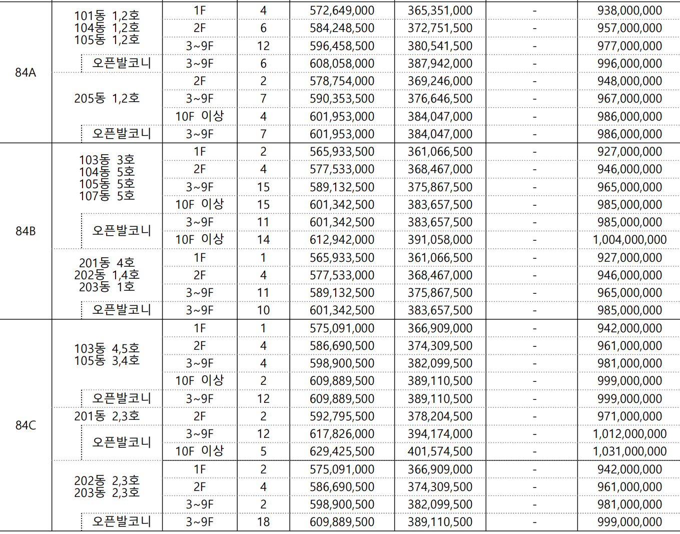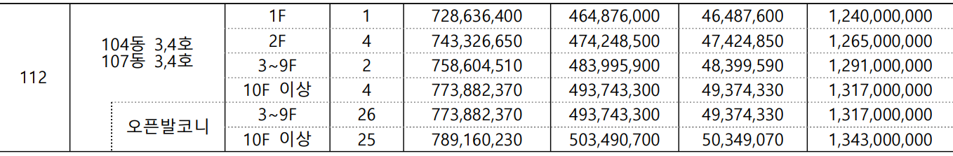 84㎡과 112㎡ 주택형의 일부층은 외부에 오픈발코니가 설치되었습니다. 오픈발코니 설치 세대의 개별 선택은 불가하며 청약신청한 주택형 내에서 무작위 추첨 배정되므로 참고하세요.