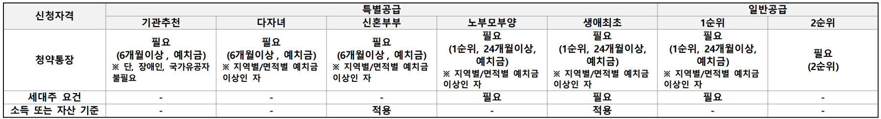 특별공급 및 일반공급 청약 시 가점항목 등 청약자격을 확인하지 않고 신청자 기개사항만으로 청약신청을 받으며 당첨자에 한하여 계약체결 시 주민등록표 등초본, 가족관계증명서 등 관련서류를 제출받아 주택공급 신청내용과 청약자격을 대조한 후 청약신청 내용과 청약자격이 일치할 경우에 계약체결이 가능하므로 청약신청 시 유의하세요.