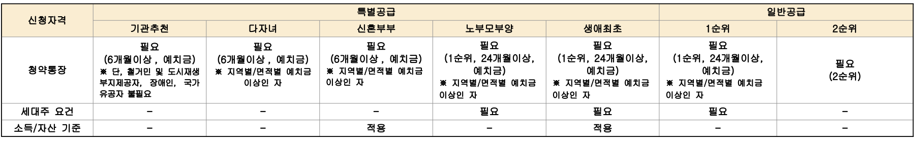 신청자격은 당첨자를 대상으로 전산조회, 제출서류 등을 통해 사업주체에서 확인하며, 확인 결과 신청자격과 다르게 당첨된 사실이 판명될 경우에는 부적격 당첨자로서 불이익(계약 체결 불가, 일정기간 입주자저축 사용 및 입주자 선정 제한 등)을 받으니 반드시 입주자 모집공고문의 신청자격, 기준, 일정, 방법, 유의사항 등을 정확히 확인 후 신청하셔야 합니다.