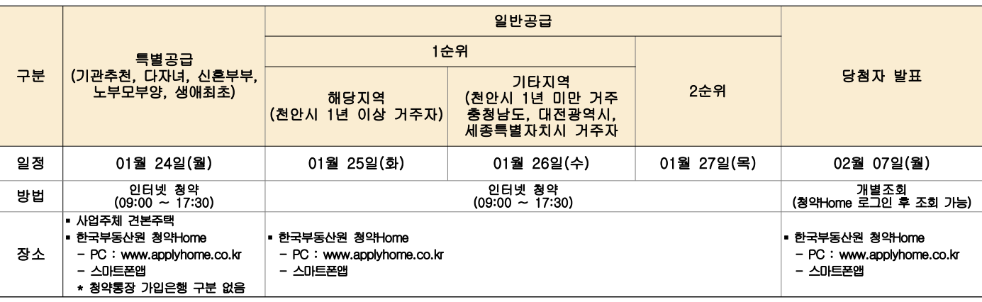 천안시에 1년 이상 계속하여 거주하는 청약 신청자에게 우선 공급하며, 1순위 청약접수를 입주자 모집공고일 기준 주민등록 표등ㆍ초본상 거주지역 및 거주기간에 따라 접수일을 분리(해당/기타)하여 접수하오니 청약접수일을 명확히 구분하여 부적격 처리, 당첨취소 등의 불이익을 받지 않도록 유의하시기 바랍니다.
