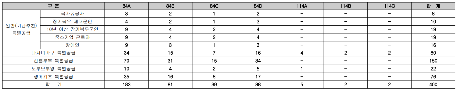 주택형별 특별공급대상 세대수는 공급세대수, 비율 등을 감안하여 배정하였으며 배정 호수가 없는 주택형에 대하여는 신청할 수 없습니다.