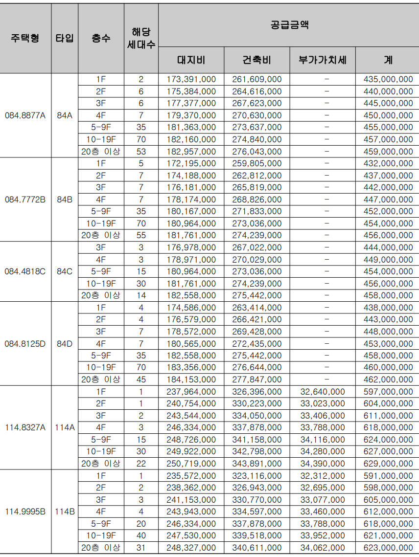 본 아파트는 분양가 상한제 미적용 민영주택으로, 상기 공급금액은 사업주체의 자체심의 결과 주택형 별, 동별, 층별, 향별 등으로 차등을 두어 조정하여 책정한 금액입니다.