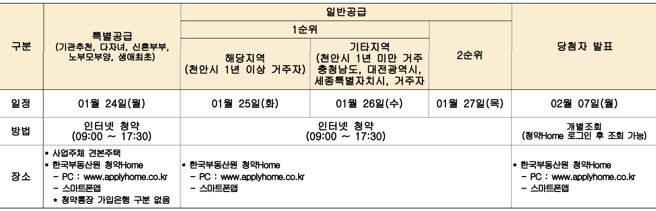 천안시에 1년 이상 계속하여 거주하는 청약 신청자에게 우선 공급하며, 1순위 청약접수를 입주자 모집공고일 기준 주민등록 표등ㆍ초본상 거주지역 및 거주기간에 따라 접수일을 분리(해당/기타)하여 접수하오니 청약접수일을 명확히 구분하여 부적격 처리, 당첨취소 등의 불이익을 받지 않도록 유의하시기 바랍니다.