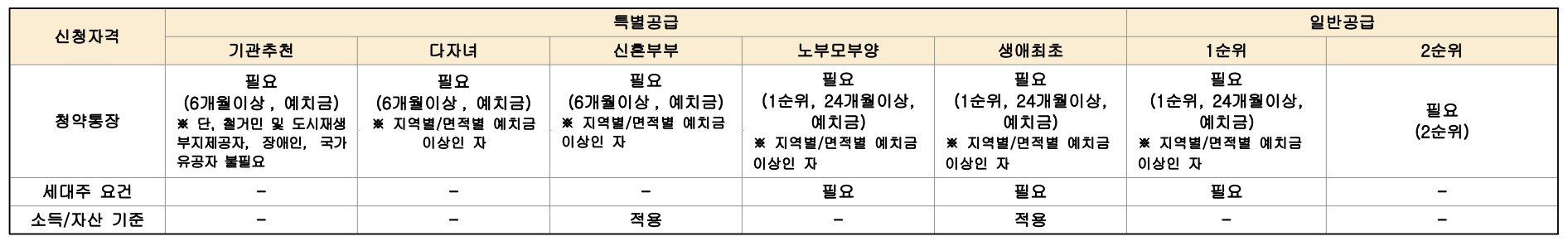 신청자격은 당첨자를 대상으로 전산조회, 제출서류 등을 통해 사업주체에서 확인하며, 확인 결과 신청자격과 다르게 당첨된 사실이 판명될 경우에는 부적격 당첨자로서 불이익(계약 체결 불가, 일정기간 입주자저축 사용 및 입주자 선정 제한 등)을 받으니 반드시 입주자 모집공고문의 신청자격, 기준, 일정, 방법, 유의사항 등을 정확히 확인 후 신청하시기 바랍니다.