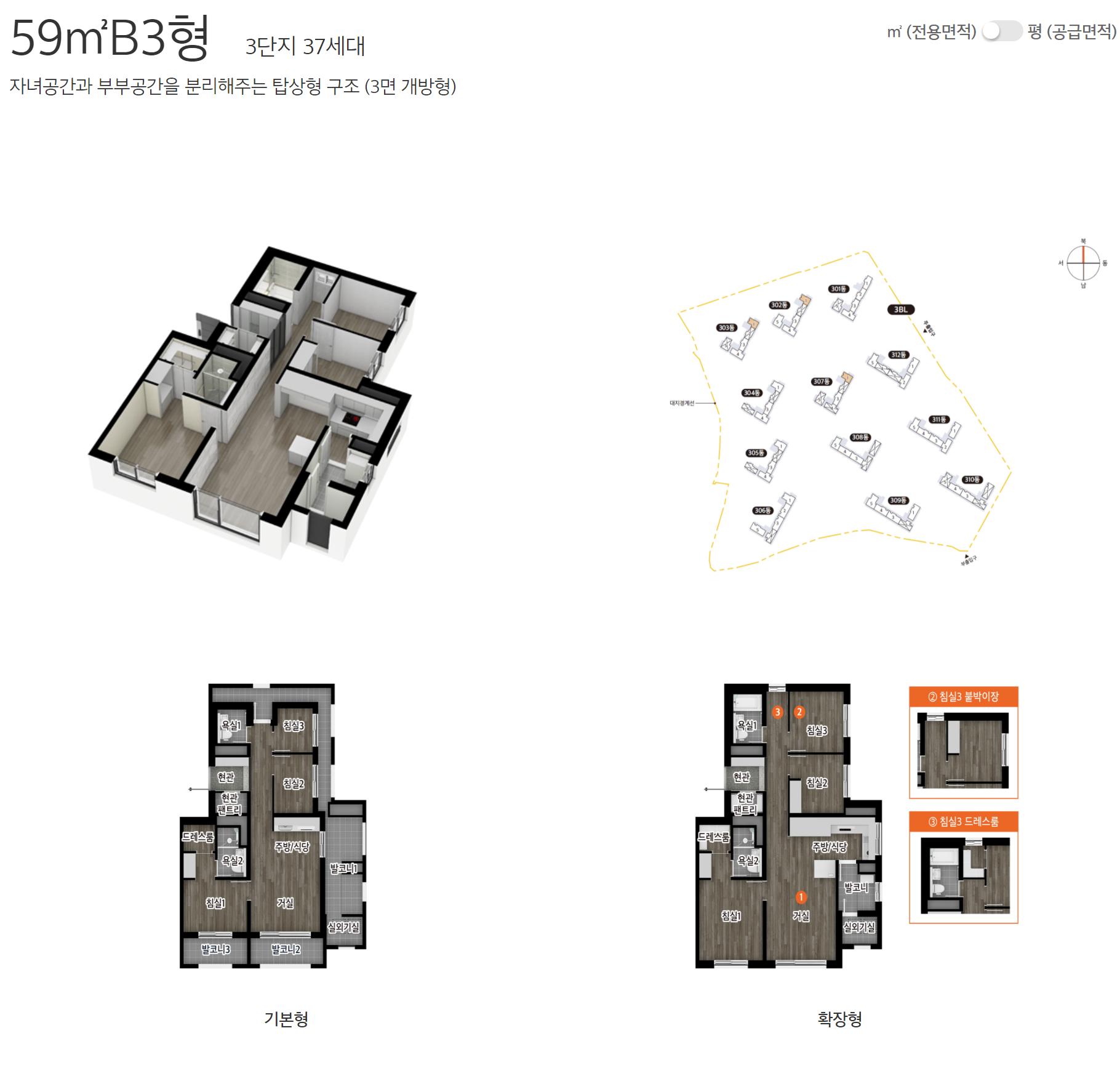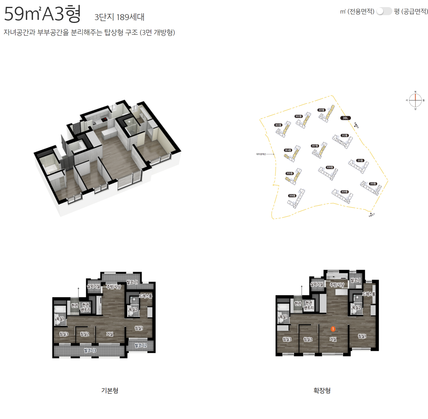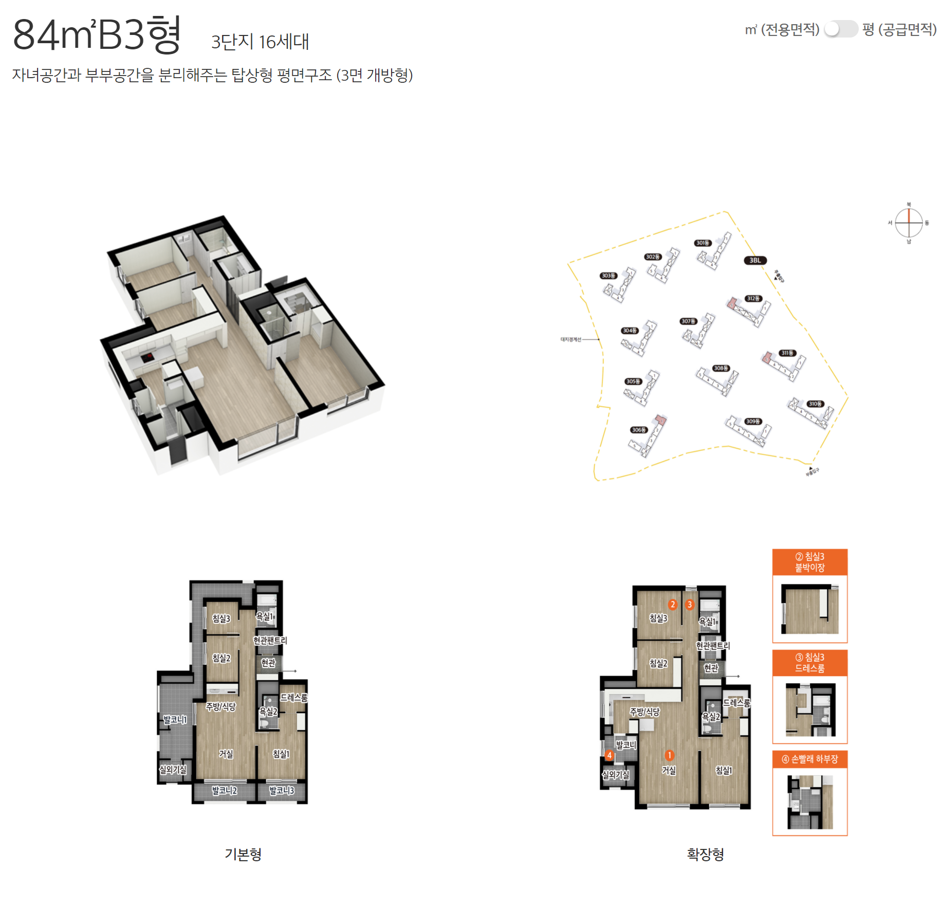 보다 자세한 편면도는 e편한세상 홈페이지에서 제작한 세대 안내 VR 영상을 참고하면 되겠습니다.