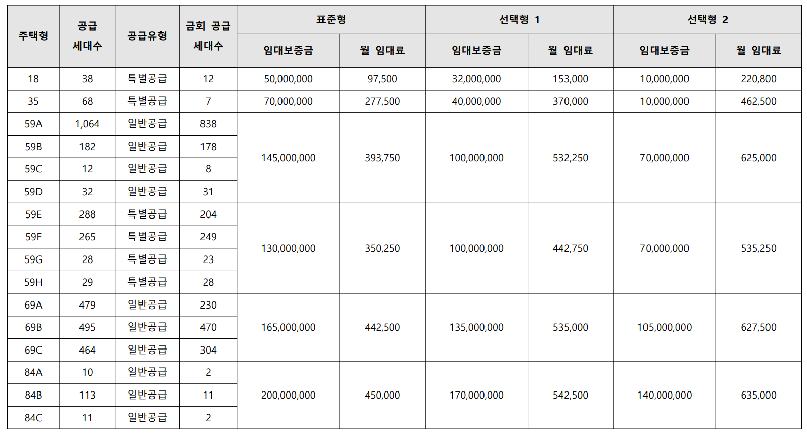 주택타입 (59A/ 59E), (59B/ 59F), (59C/ 59G), (59D/ 59H) 타입은 공급 내용(일반/특별)을 나누기 위하여 구분한 것으로 동일한 면적입니다.