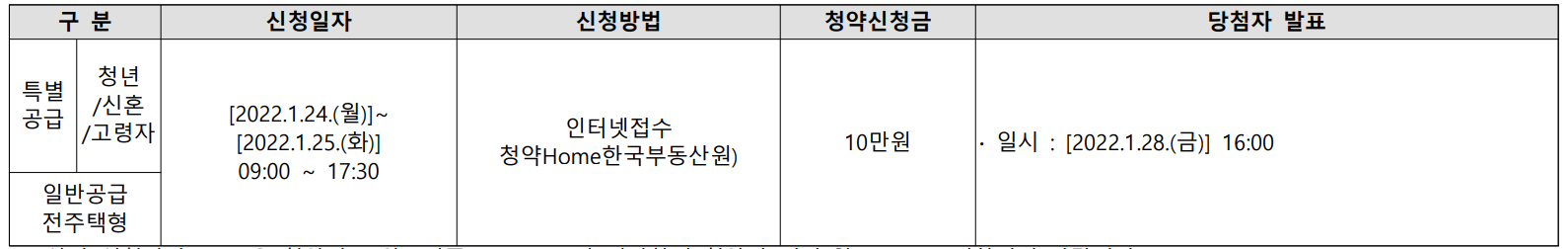 특별공급 및 일반공급 전 주택형을 1월 24일 월요일부터 1월 25일 화요일까지 진행하며 청약신청금은 10만원입니다. 당첨자 발표는 1월 28일 청약홈에서 로그인 후 개별 확인할 수 있습니다.
