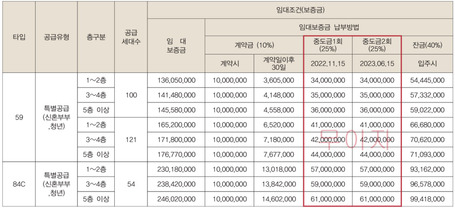 주택타입 59형은 청년과 신혼부부에 특별공급 되며, 당첨자 발표 이후에 서류 검토 후 사업주체와 익산시청의 최종 확인에 따른 정당 당첨자의 소득기준 하위 순번 100세대(청년 60세대, 신혼부부 40세대)에 대하여 공고한 임대보증금으로 계약일 전 개별 통보하여 공급될 예정입니다. 또한, 주택형 59 타입의 121세대는 청년 73세대, 신혼부부 48세대로 공급될 예정입니다.