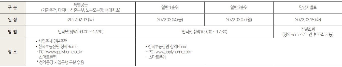 본 아파트의 최초 입주자 모집공고일은 2022.01.20.입니다.(청약자격조건의 기간, 나이, 지역우선 등의 청약자격조건 판단 기준일입니다.)