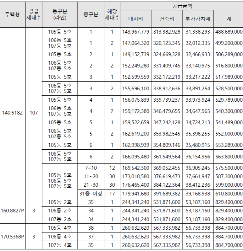 본 아파트의 공급가격은 각 세대의 주택형 별, 층별 등의 다양한 조건들을 고려하여 책정한 금액으로 최저 2억 2,030만 원부터 최고 8억 8,470만 원까지로 평당가 1,088만 원/3.3㎡ 형성되어 있습니다.