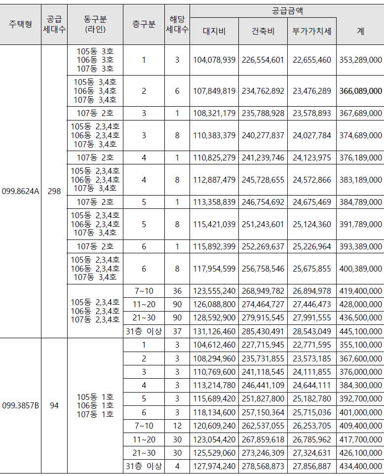 최저 분양가 3억 5,328만 원부터 최고 분양가 4억 4,510만 원으로 평당가 1,091만 원에서 1,113만 원으로 A, B 타입별로 차이가 있습니다.