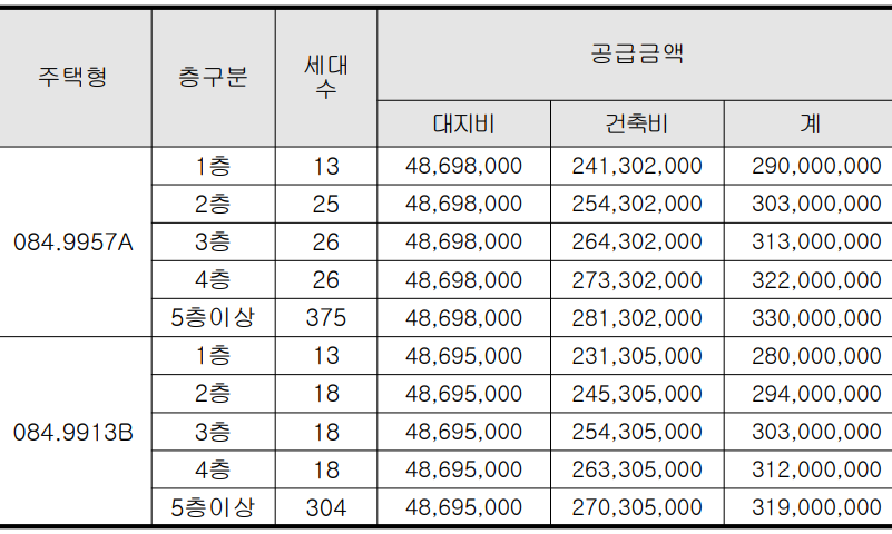 84A타입 최저 2억 9천만 원부터 최고 3억 3,000만 원 평당가 983만 원,
