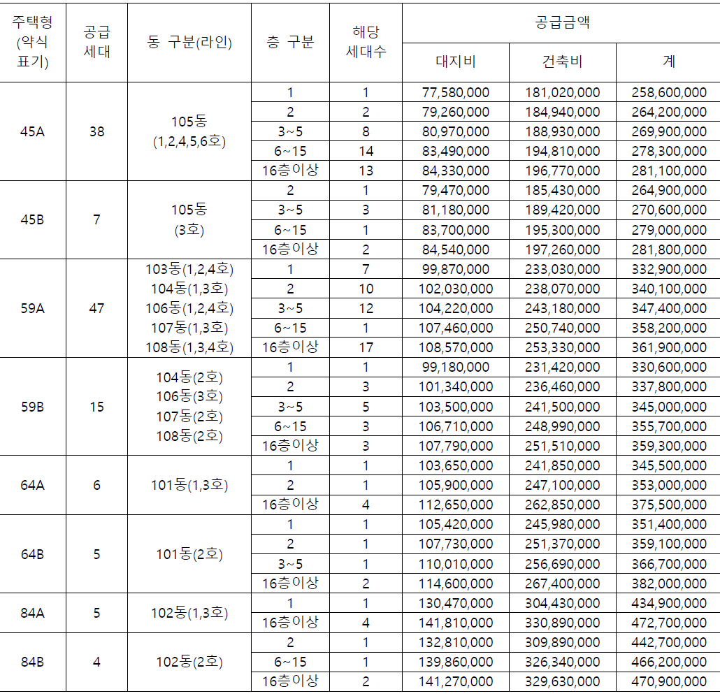 45㎡A 38가구, 45㎡B 7가구, 59㎡A 47가구, 59㎡B 15가구, 64㎡A 6가구, 64㎡B 5가구, 84㎡A 5가구, 84㎡B 4가구로 공급됩니다.