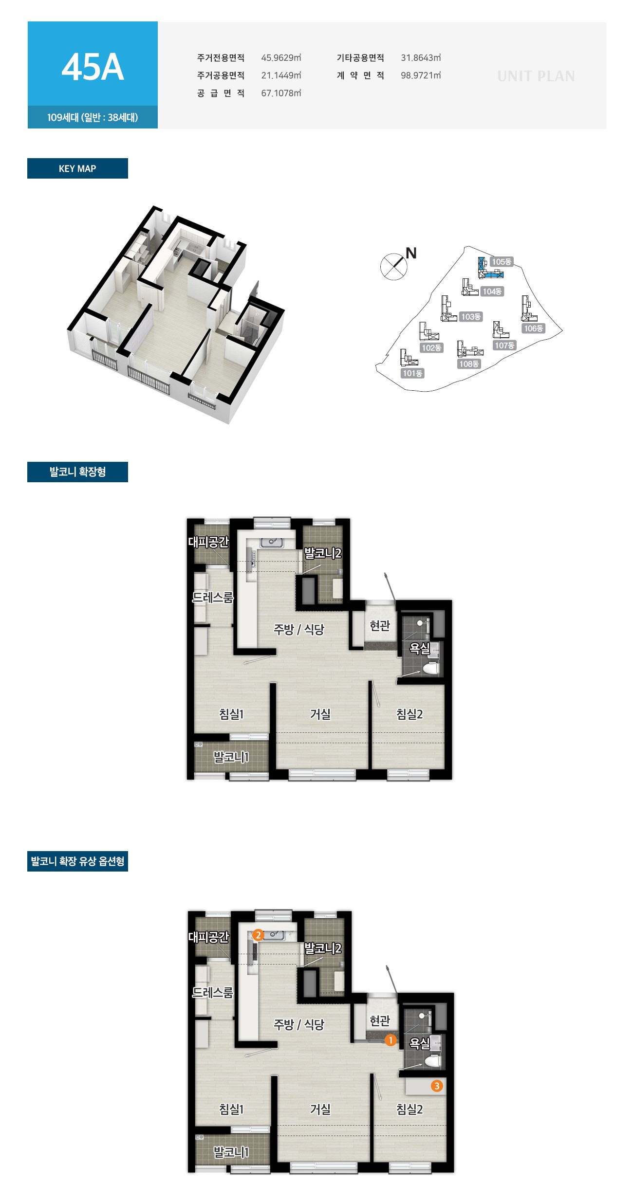 45㎡A 타입의 경우 3 Bay 2 Room 판상형 구조로 시공돼 통풍과 일조에 유리하며 드레스룸을 함께 제공해 넉넉한 수납공간을 갖췄습니다.