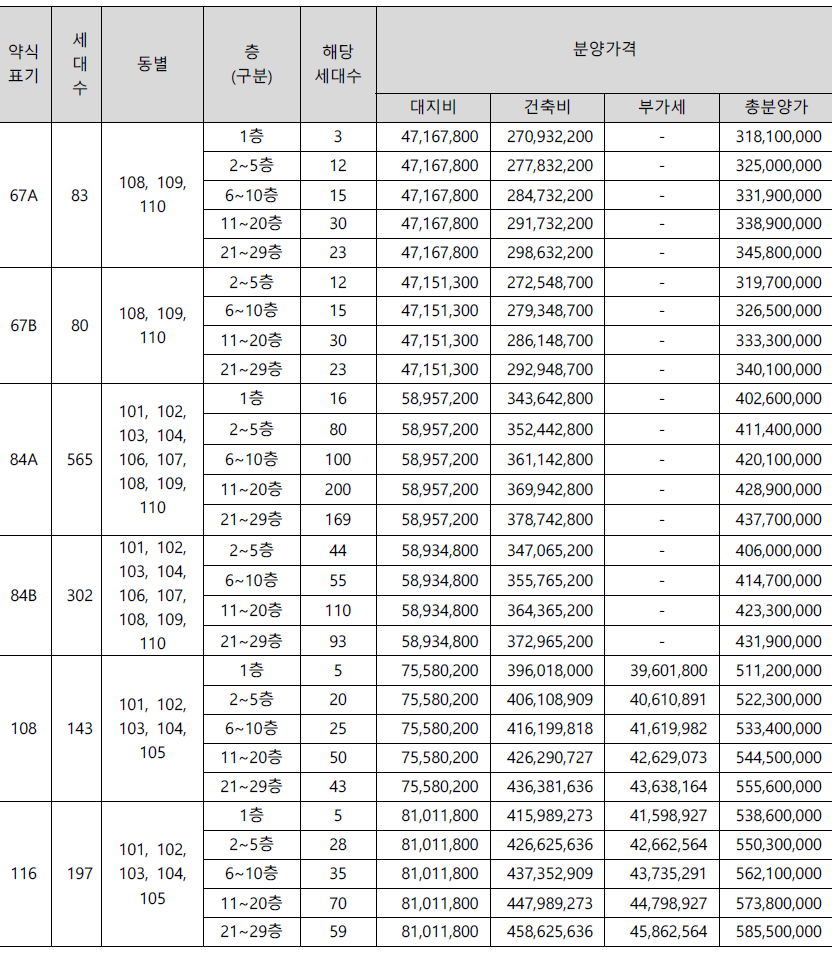 분양가에는 각 주택형별 모두 소유권이전등기 비용 및 취득세가 포함되어 있지 않으며, 전용면적 85㎡를 초과하는 주택은 부가가치세가 포함된 금액입니다.