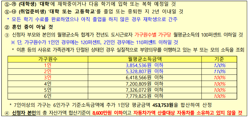 만 19세 이상 만 39세 이하인 사람 또는 소득이 있는 업무에 종사한 기간이 총 5년 이내이며, 아래의 하나에 해당하는 사람입니다.