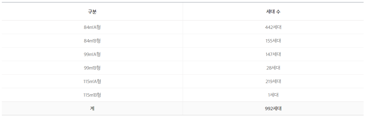 전세대 4베이 판상형 구조, 전세대 중대형 평수 위주로 조성이 되어 84㎡A 타입 442세대, 84㎡B 155세대, 99㎡A 147세대, 99㎡B 28세대, 115㎡A 219세대, 115㎡B 1세대로 구성되어 있습니다.