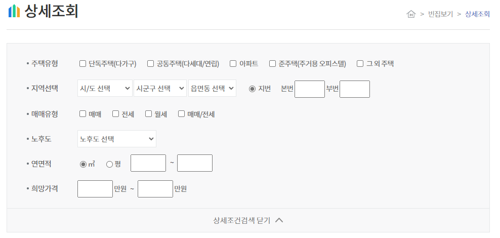 공가랑 공식 사이트에 접속하면 지도로 찾는 방법과 주택유형, 지역 선택, 매매 유형, 노후도, 연면적, 희망 가격 등으로 상세조회도 할 수 있으므로 원하는 형식으로 빈집을 조회할 수 있습니다.