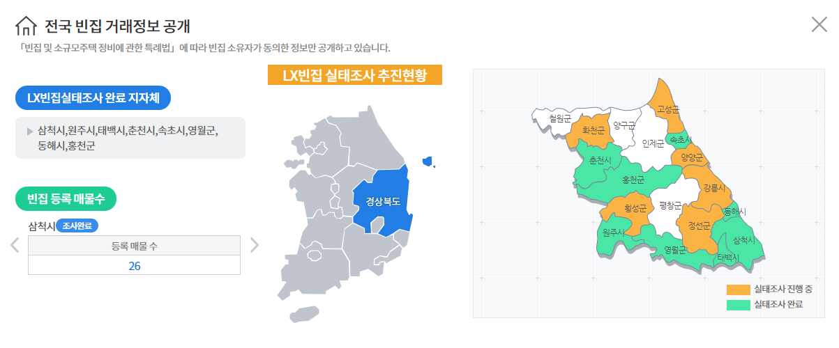 공가랑 서비스는 전국 지자체 검색이 가능하지만 LX빈집실태조사가 완료된 지자체 정보만 확인할 수 있으며, 빈집 소유자가 동의한 정보만 공개가 되므로 전국의 빈집에 대한 100% 완벽한 정보제공은 되지 않고 있습니다.