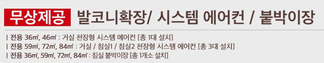 아파트 공급금액에는 발코니 확장 등의 추가선택품목 비용이 포함되지 아니한 가격이고, 발코니 확장 및 천장형 시스템에어컨 (전용 36㎡/46㎡는 거실에 천장형 시스템에어컨 총 1대 설치, 전용 59㎡/72㎡/84㎡는 거실/침실 1/침실 2에 천장형 시스템에어컨 총 3대 설치), 침실 붙박이장 1개(전용 36㎡/59㎡/72㎡/84㎡에 한함)는 추가선택품목으로서 무상으로 공급됩니다. 이외의 빌트인 가전 등의 추가선택품목은 공급하지 않습니다.