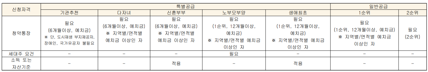 특별공급 및 일반공급 신청자격에 대해서는 신청자격, 기준, 일정, 방법, 유의사항 등을 정확히 확인 후 신청하셔야 합니다.