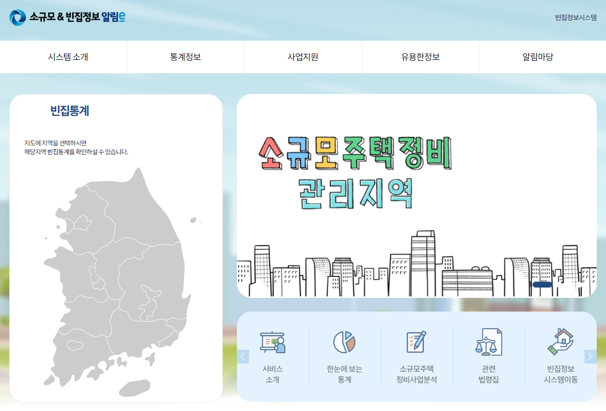 새롭게 오픈한 빈집플랫폼 소규모&빈집정보 알림e는 한국부동산원에서 운영하는데 빈집 정비 사업과, 소규모 주택정비사업, 소규모 주택정비 관리계획등으로 관리체계를 일원화 하기 위해 구축된 서비스인만큼 빈집정보를 얻고 싶은 분이라면 활용하시면 되겠습니다.