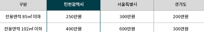 민간분양 청약예치금은 인천광역시 기준 전용면적 85㎡ 이하 평형은 250만 원, 전용면적 102㎡ 이하 평형은 400만 원으로 청약자의 주민등록표등본상 거주지 기준 금액입니다.
