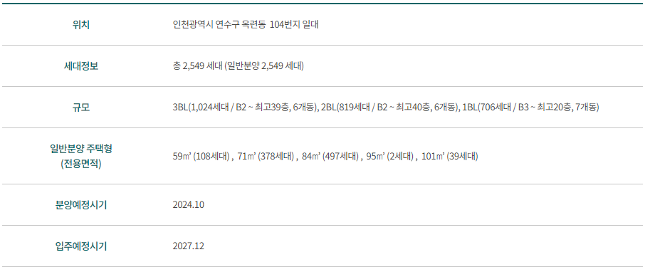 인천광역시 연수구 옥련동 104번지 일대에 3개 블록으로 구성되어 있으며, 총 2,549세대를 일반분양으로 공급합니다.