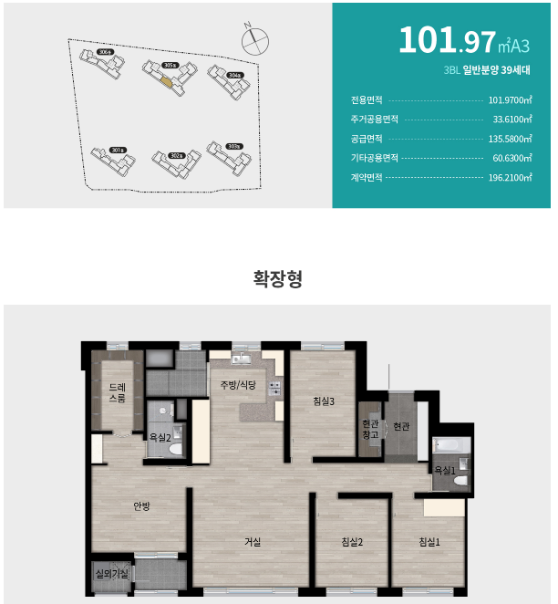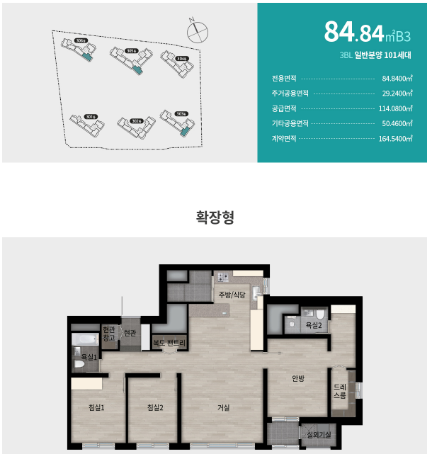 59㎡ 108세대, 71㎡ 378세대, 84㎡ 497세대, 95㎡ 2세대, 101㎡ 39세대입니다. 각 평형별로 A~C 타입으로 구분되므로 다음 평면도를 참고하세요.