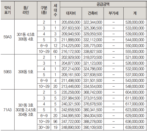 상기 분양금액에는 주택형별 소유권 이전등기비용, 취득세(등록세 포함), 인지세 등이 미포함되어 있으며, 전용면적 85㎡를 초과하는 주택형은 부가가치세가 포함된 금액입니다.