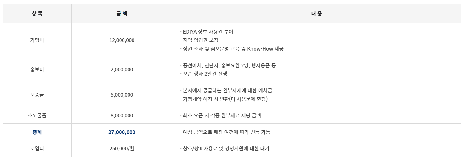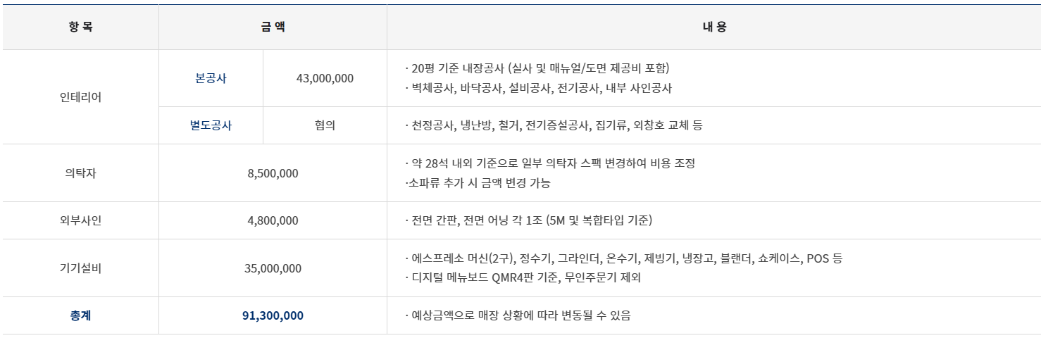 가맹비와 인테리어 비용으로 분류해서 본사 홈페이지에 공지된 내용으로 정리했습니다.