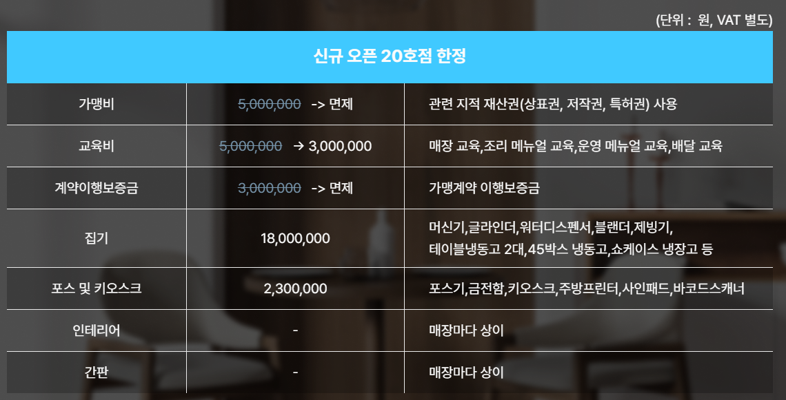 신규 오픈 20호점 한정 가맹비 면제, 교육비 200만 원 인하, 계약이행보증금 면제 혜택을 받을 수 있습니다.