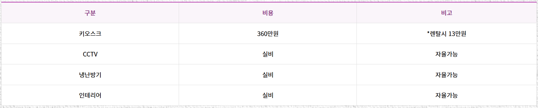 - 무인 시스템: 키오스크, CCTV, 도난방지 시스템 (약 500만~1000만 원)