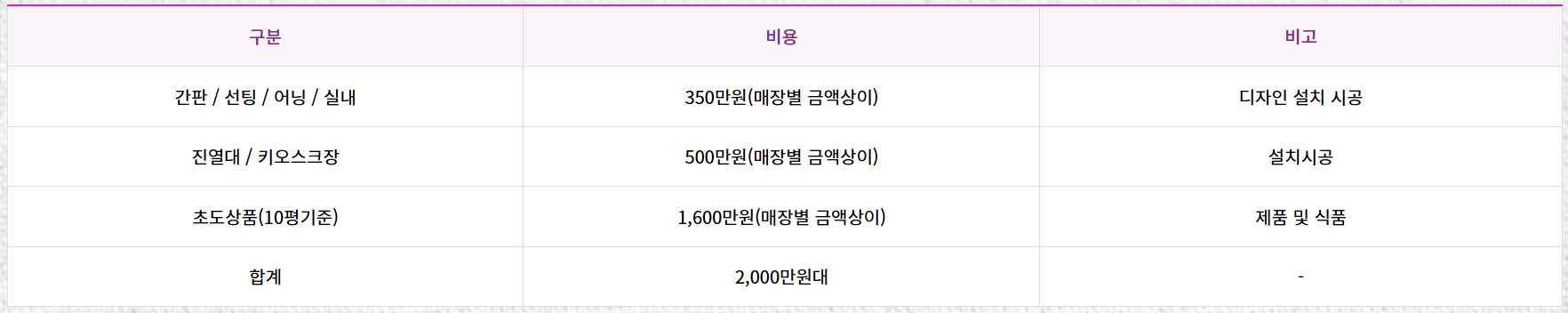 - 인테리어: 간단한 진열장, 조명, 브랜드 로고 등 (약 500만~1000만 원)