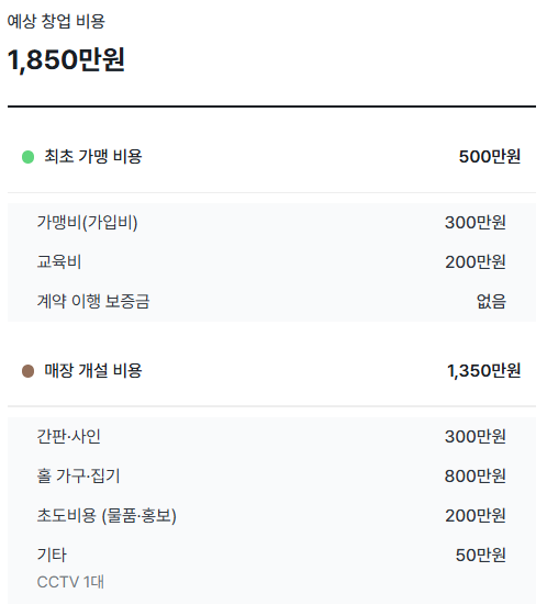 다른 업종의 매장을 운영하면서 샵입샵 형태로 운영을 하고자 한다면 예상 창업비용은 1,850만 원입니다.