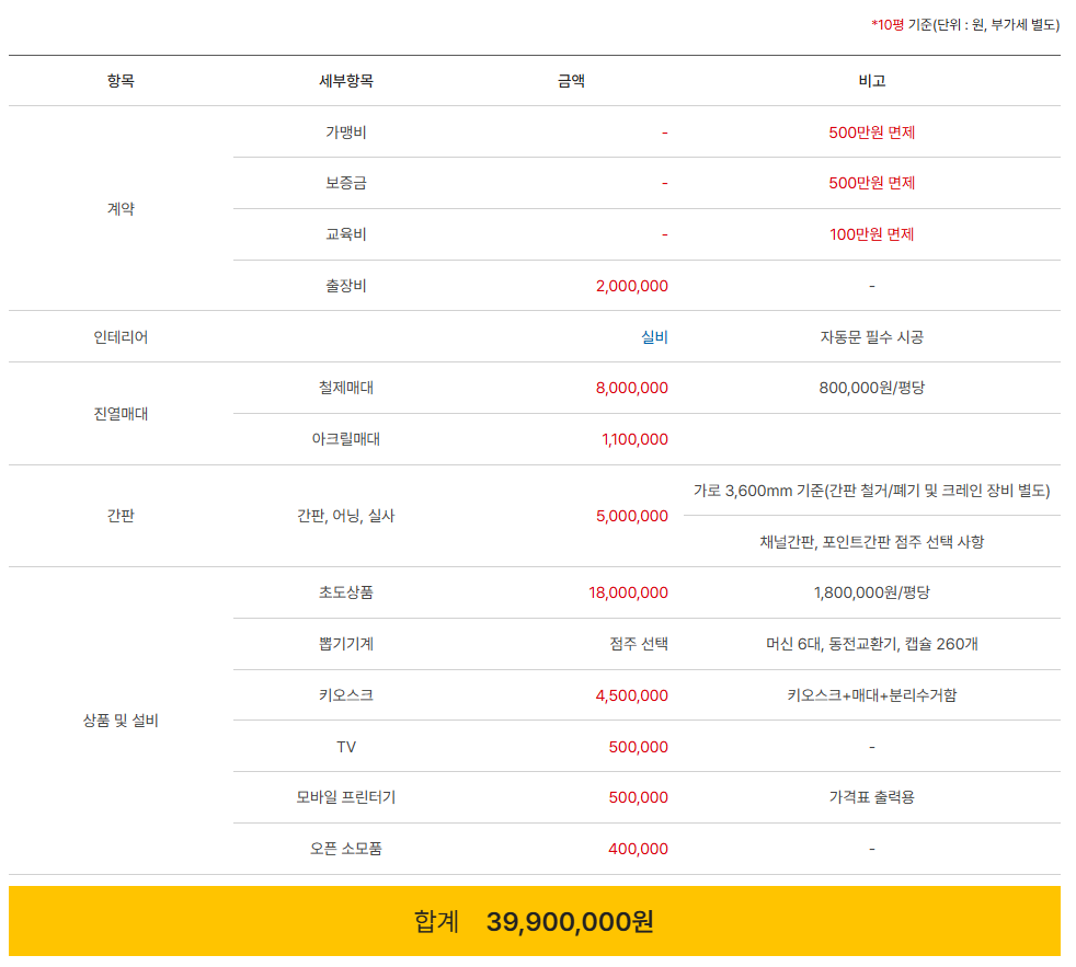 | 집기 및 가구 (진열대, 카운터 등) | 300만~700만 원 |