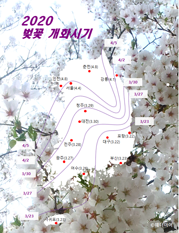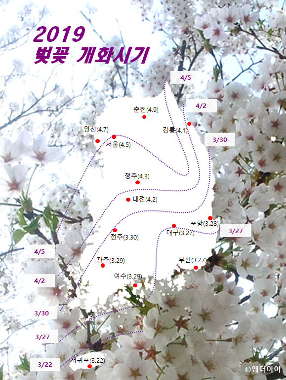 3월 22일쯤 제주부터 벚꽃 개화를 시작으로