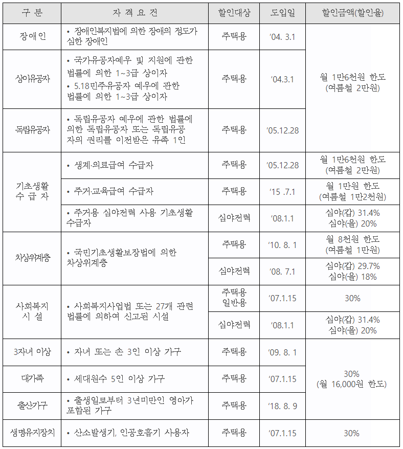 한국전력 전기요금 복지할인 대상자 및