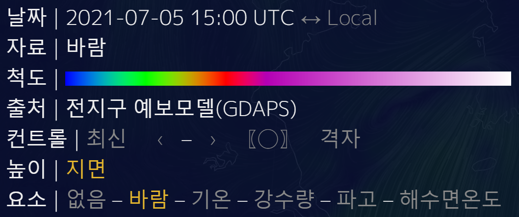 기상청비주얼맵은 지구 전체 지표, 해수면 부근의 전반적인 기상상황에 대한 쉽고 직관적인 이해를 돕기 위해 기상청 수치예보모델에서 생산하는 예측자료와시각화프로그램을 활용 제작한 화면인데 불확실성을 포함하고 있는 수치예보모델이 생산하는 예측자료로 기상청에서 공식적으로 발표하는 예보 및 관측정보와는 다를 수 있어 참고용으로만 활용하면 되는데 저는 태풍위치 또는 바람, 강수량 등을 볼 수 있어서 가끔 접속해서 확인하게 되더라구요.