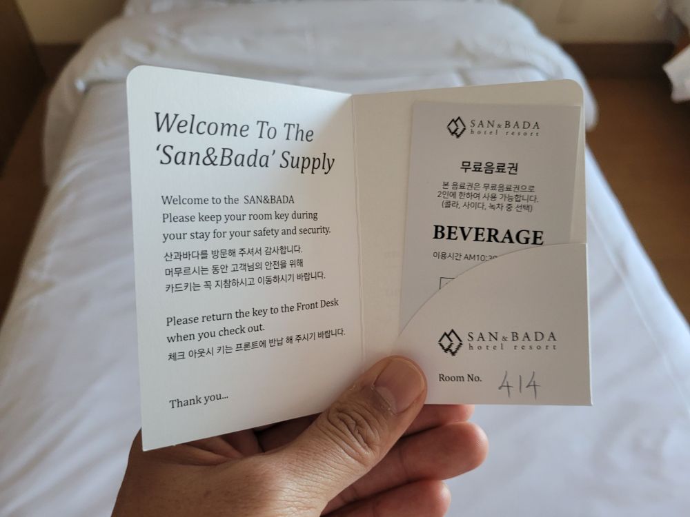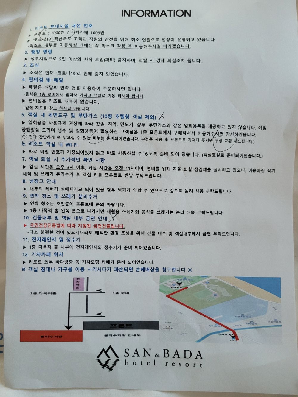이 외에 여러가지 투숙시 안내사항이 있는데 리조트 내부에는 편의점이 없으니 밖에 있는 편의점을 이용해야 하고 전자레인지는 객실내에 없어서 1층 로비에서 이용해야 합니다.